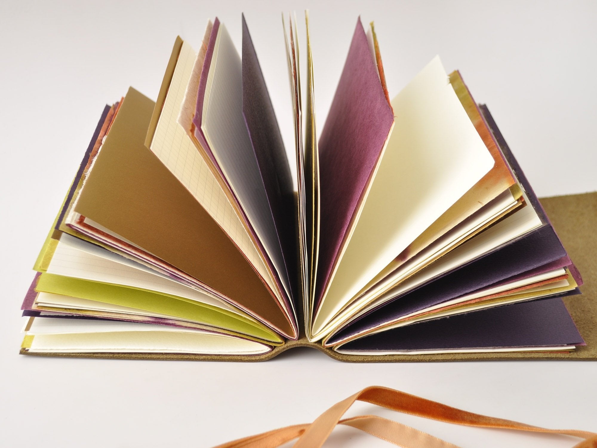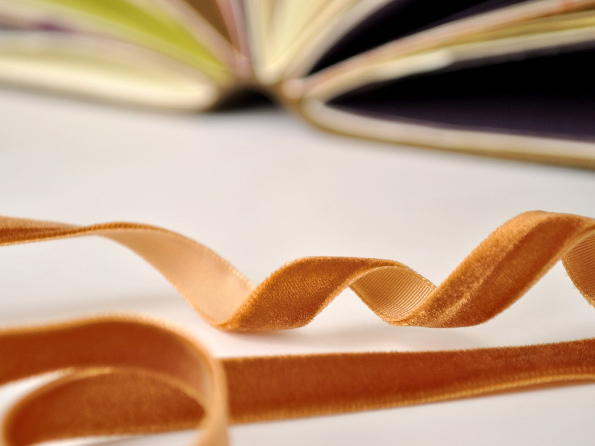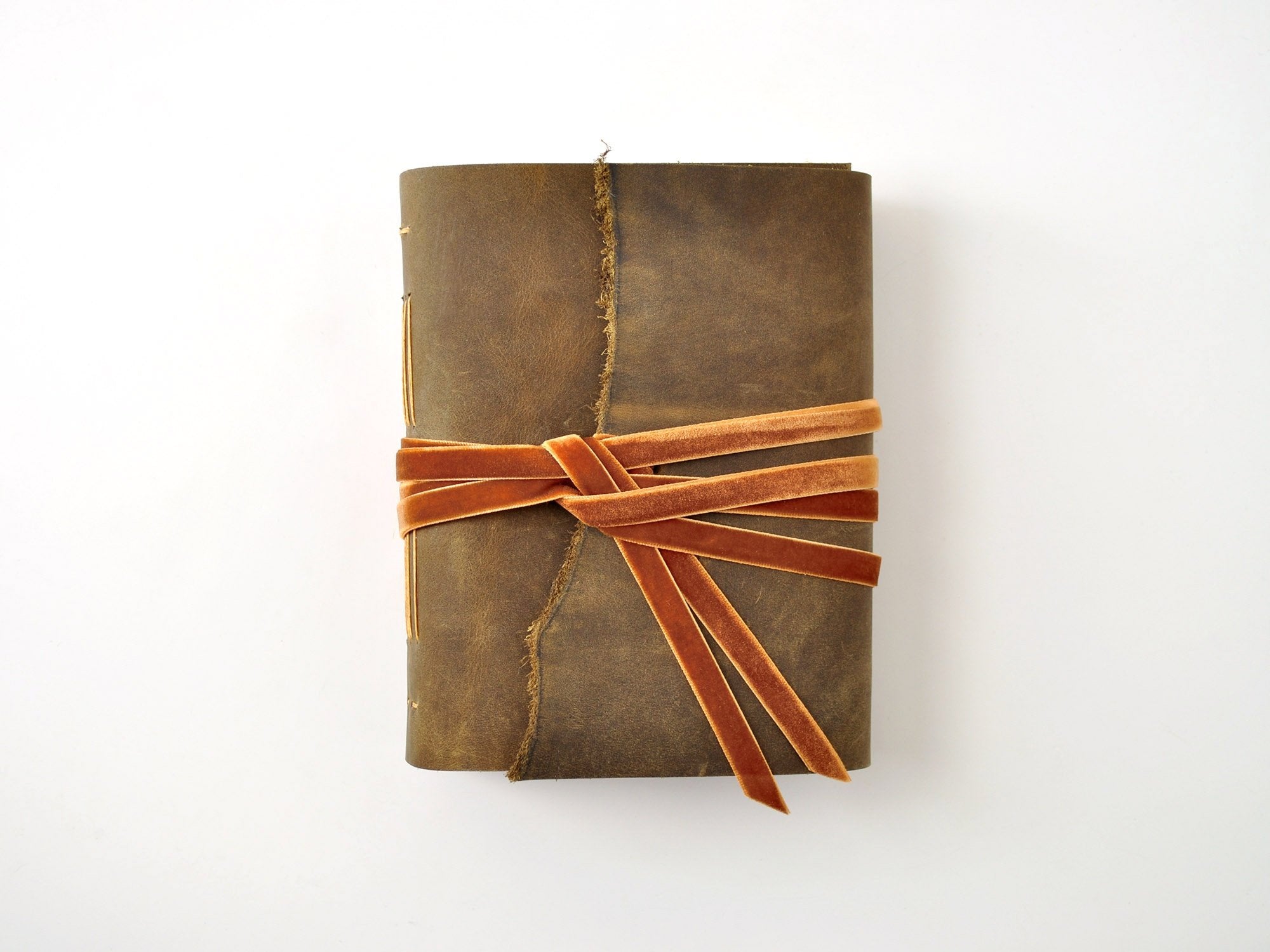 The journal is finished with a flap and a rich cinnamon velvet ribbon that ties around the book block to hold the cover closed when you are not writing.