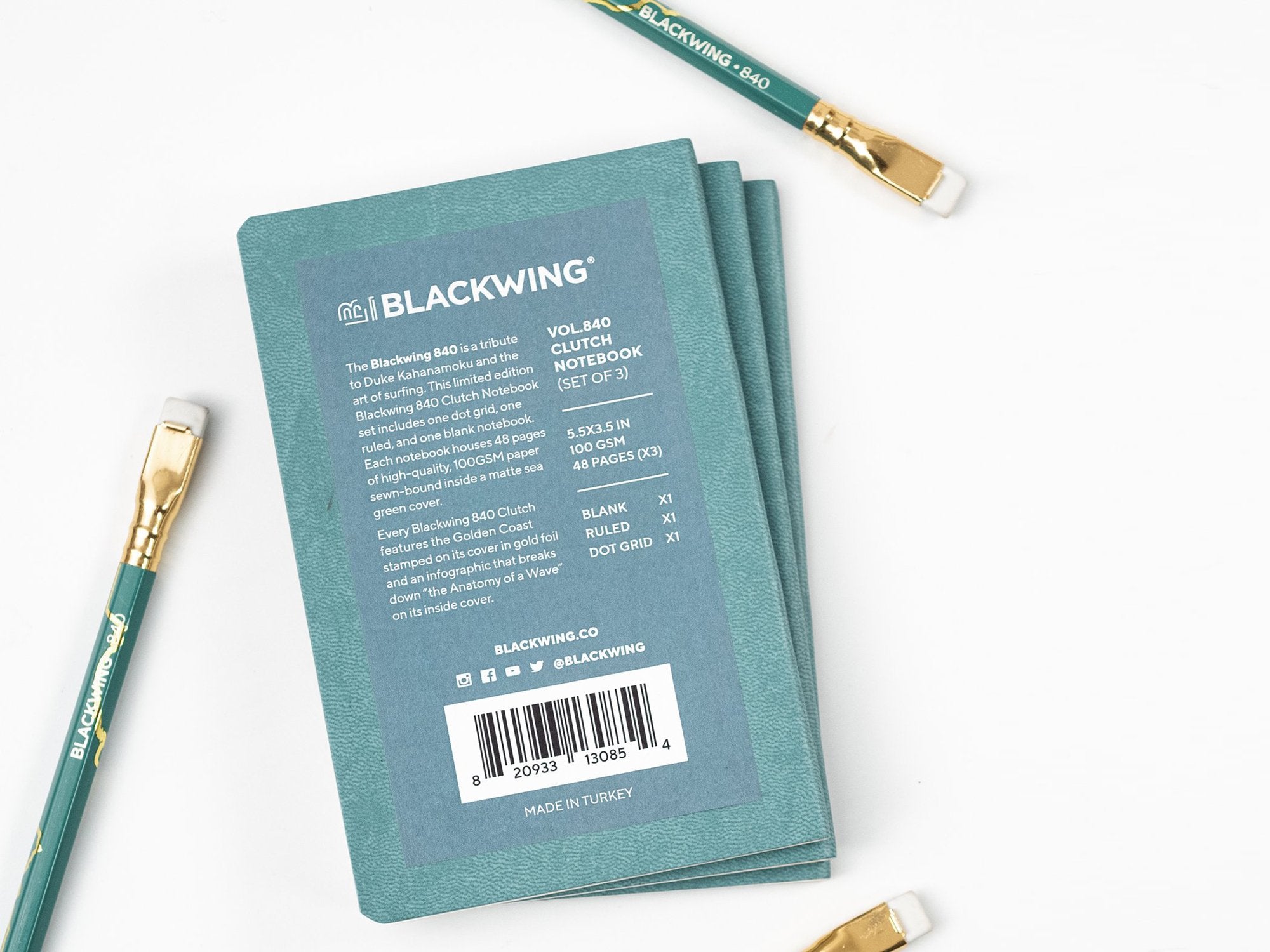 The Blackwing 840 is a tribute to Duke Kahanamoku and the art of surfing. This limited edition Blackwing 840 Clutch Notebook set includes one dot-grid, one ruled, and one blank notebook. Each notebook houses 48 pages of high-quality, 100GSM paper sewn-bound inside a matte sea green cover.