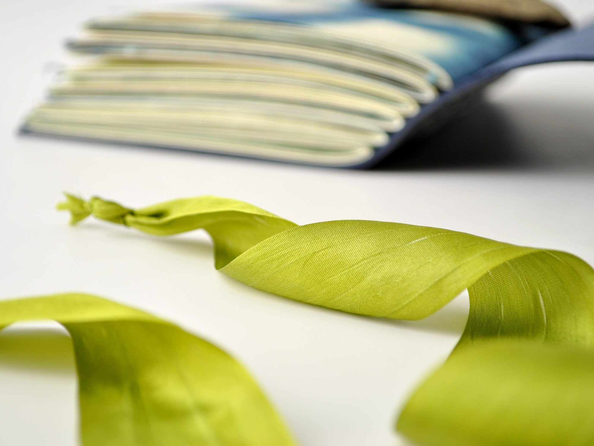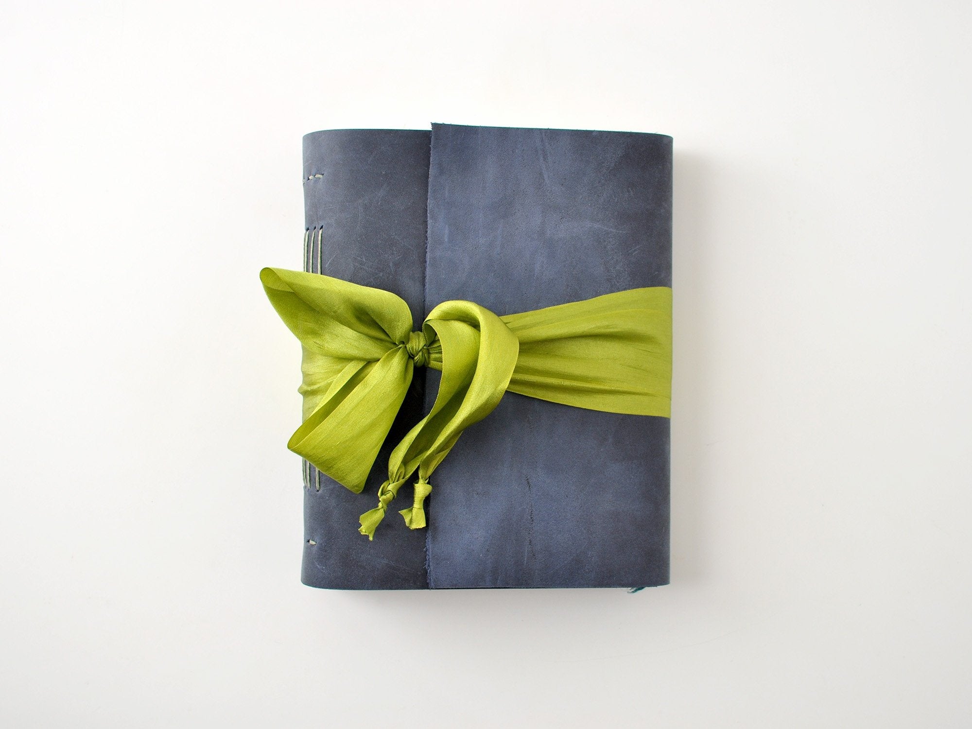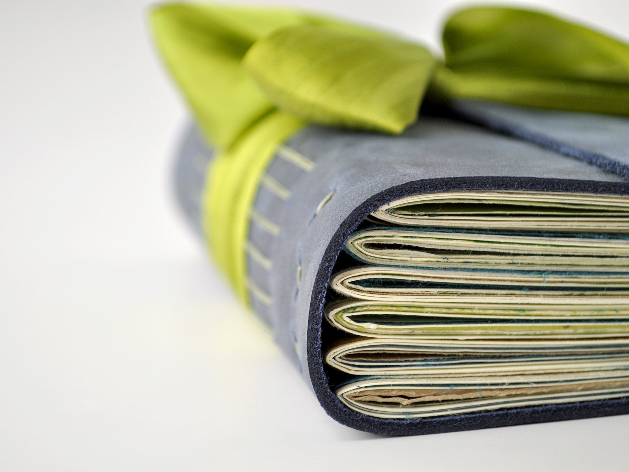 The journal is finished with a flap and a sprout green ribbon that ties around the book block to hold the cover closed when you are not writing.
