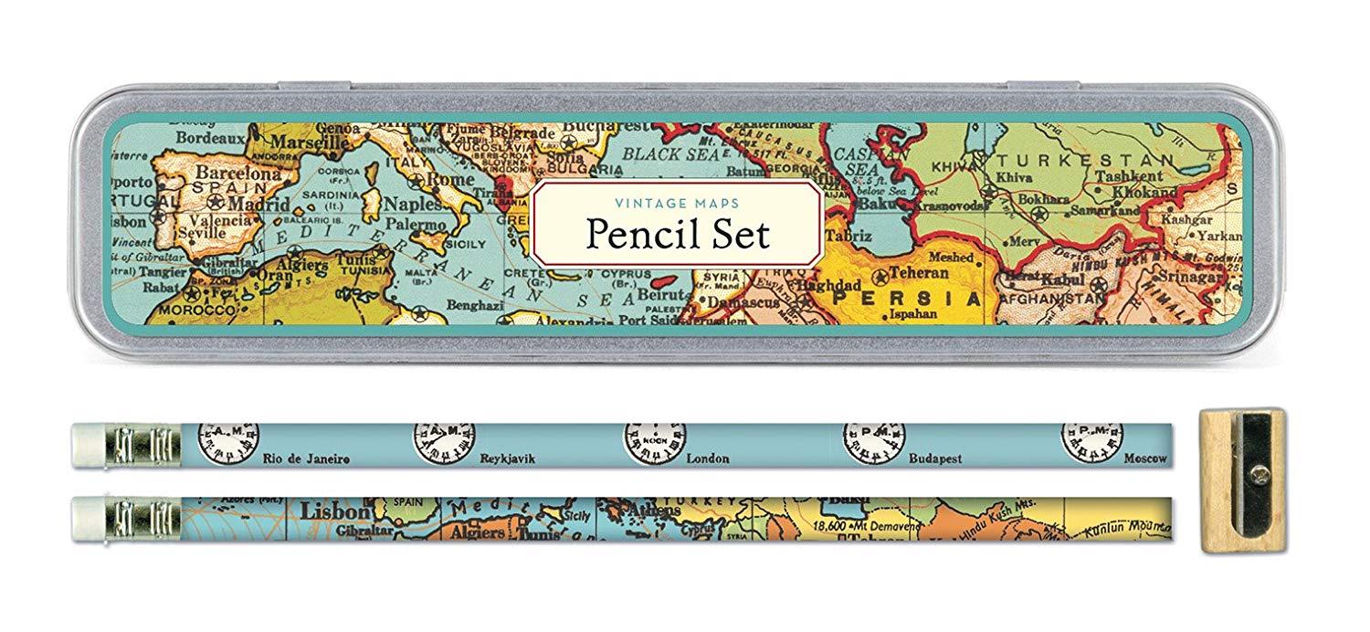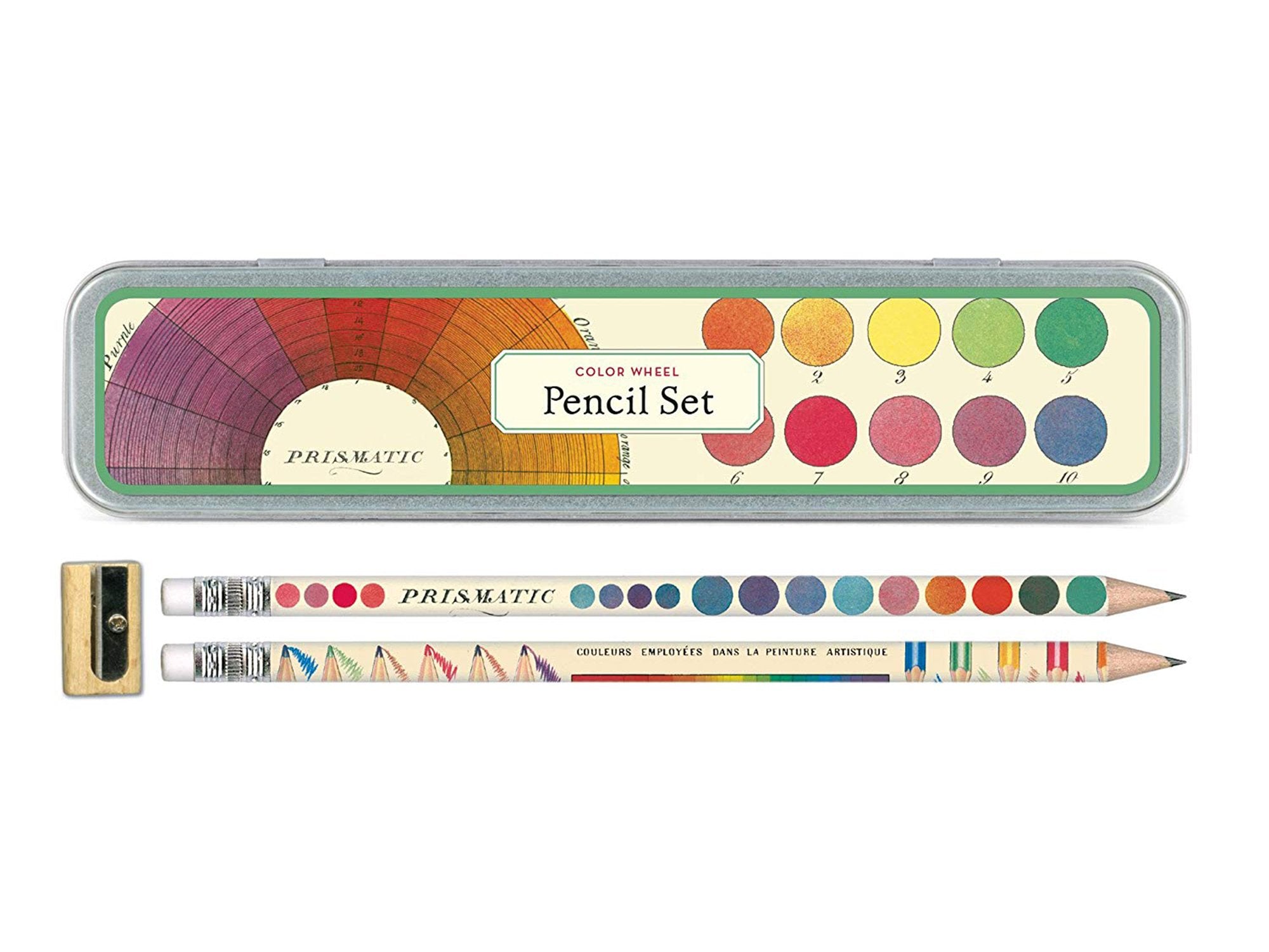 • 10 pencils (5 per design) and a sharpener packaged in a tin