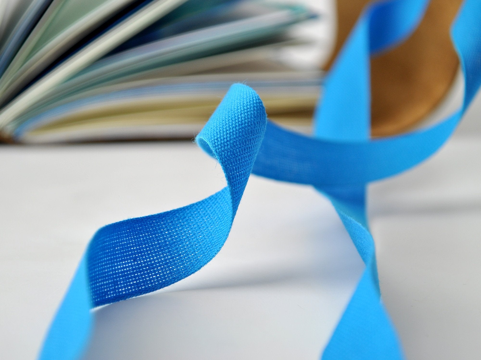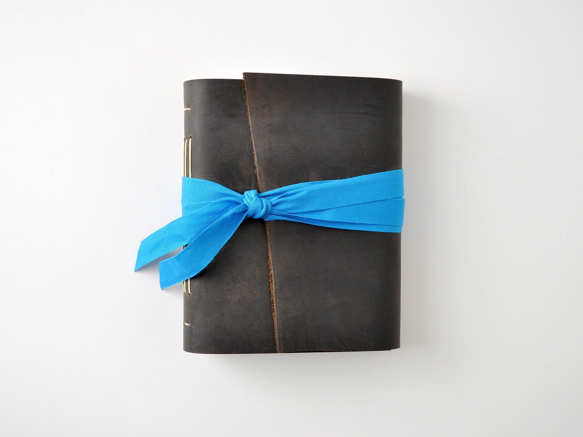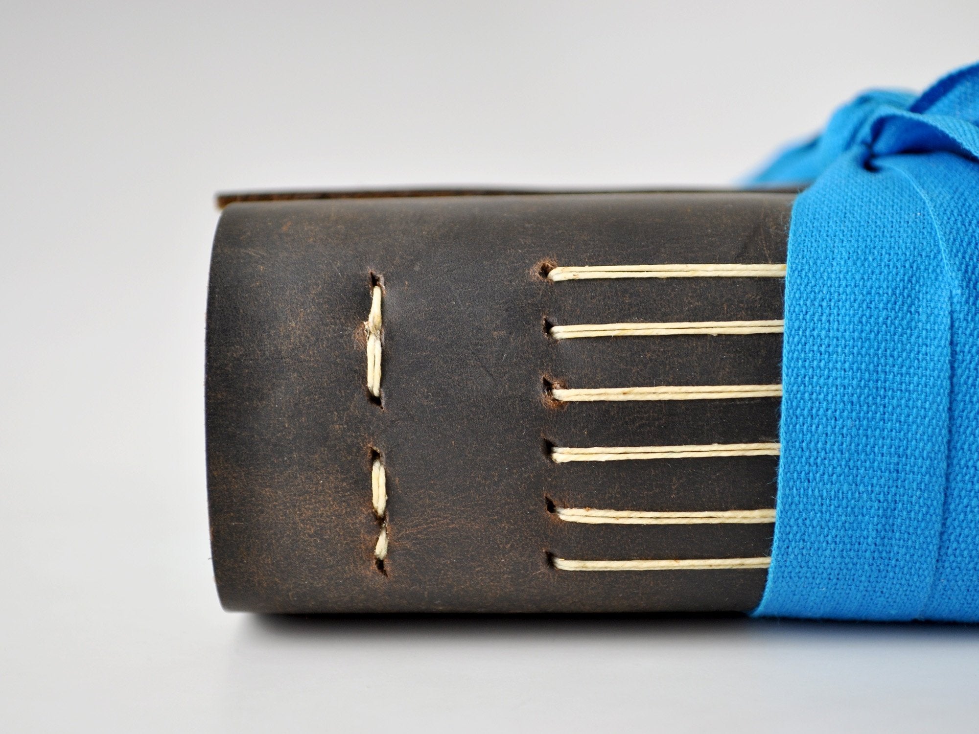 The journal is finished with a flap and turquoise cotton twill strap that ties around the book block to hold the cover closed when you are not writing.
