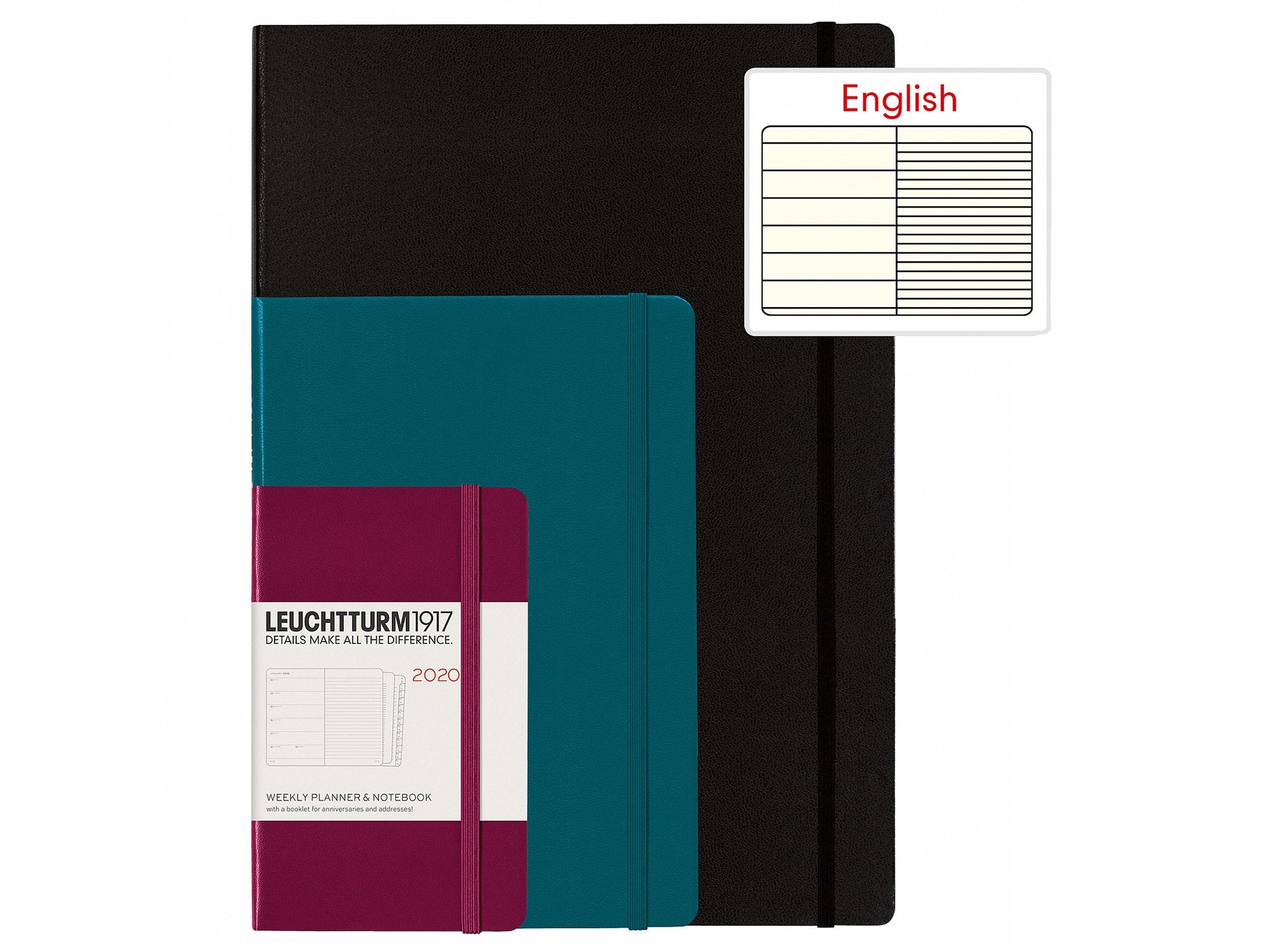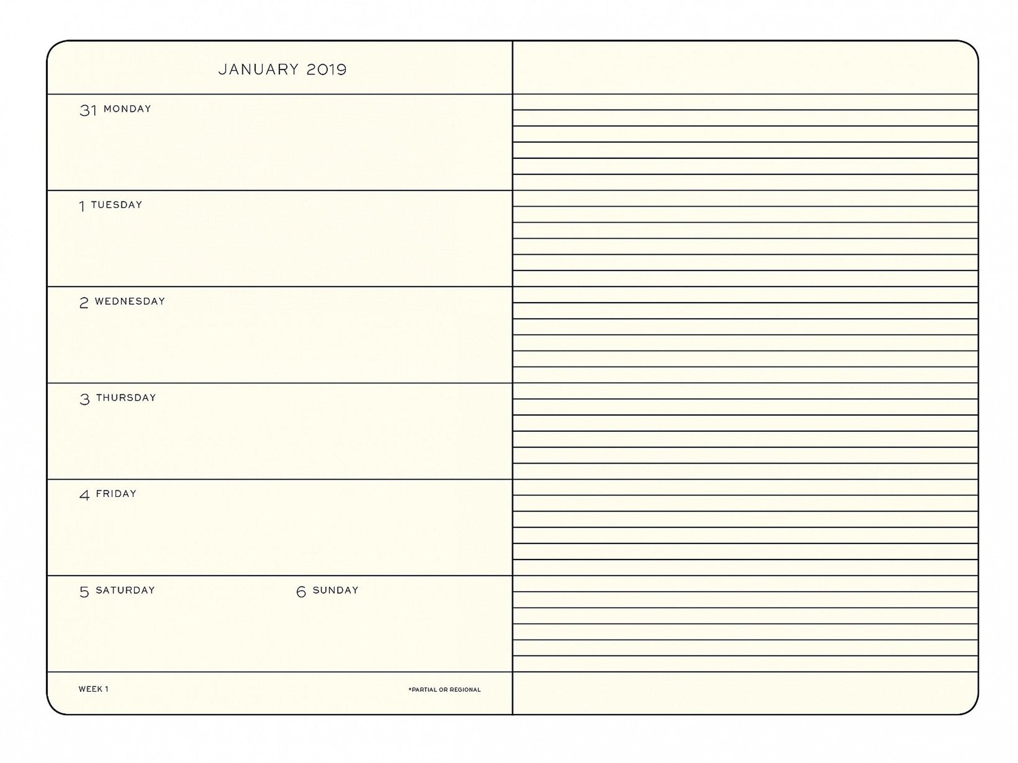 In the weekly planner and notebook, a week is shown on one page. Each day has its own box, and the days are printed from top to bottom. The right-hand side features a ruled notebook page.