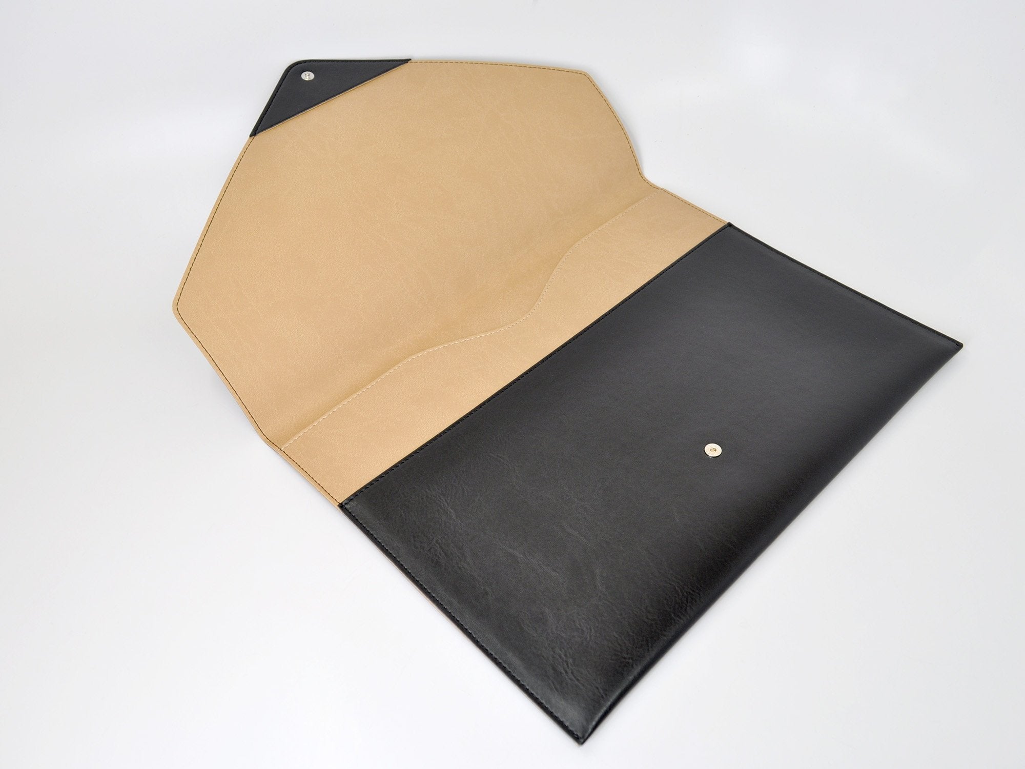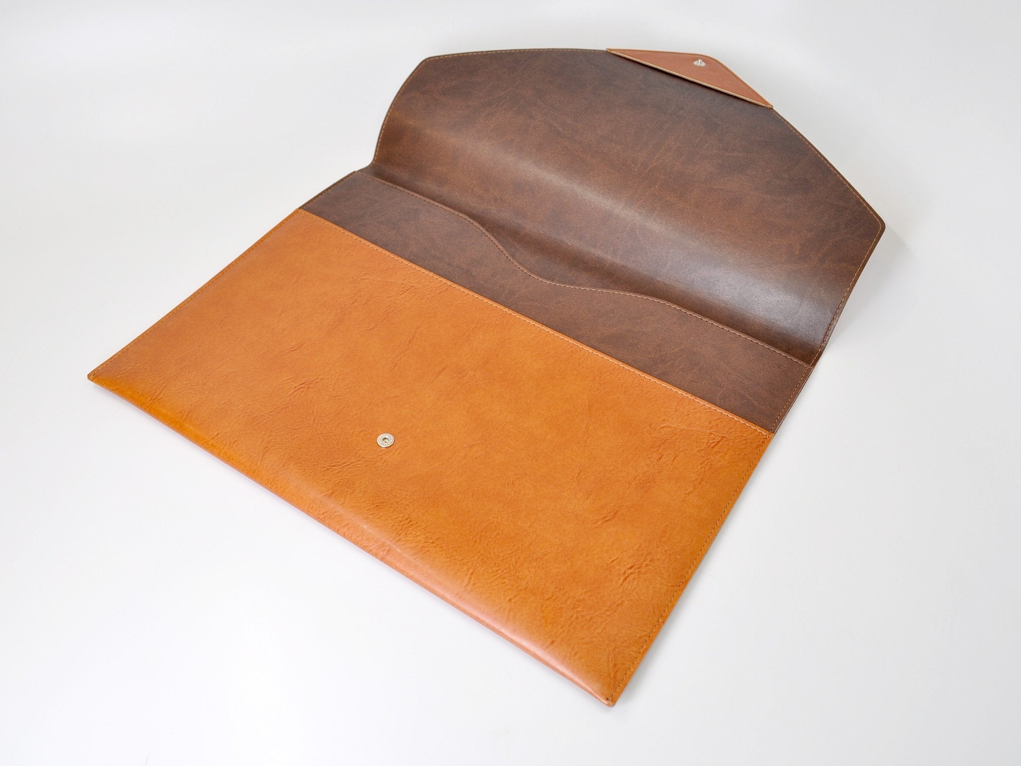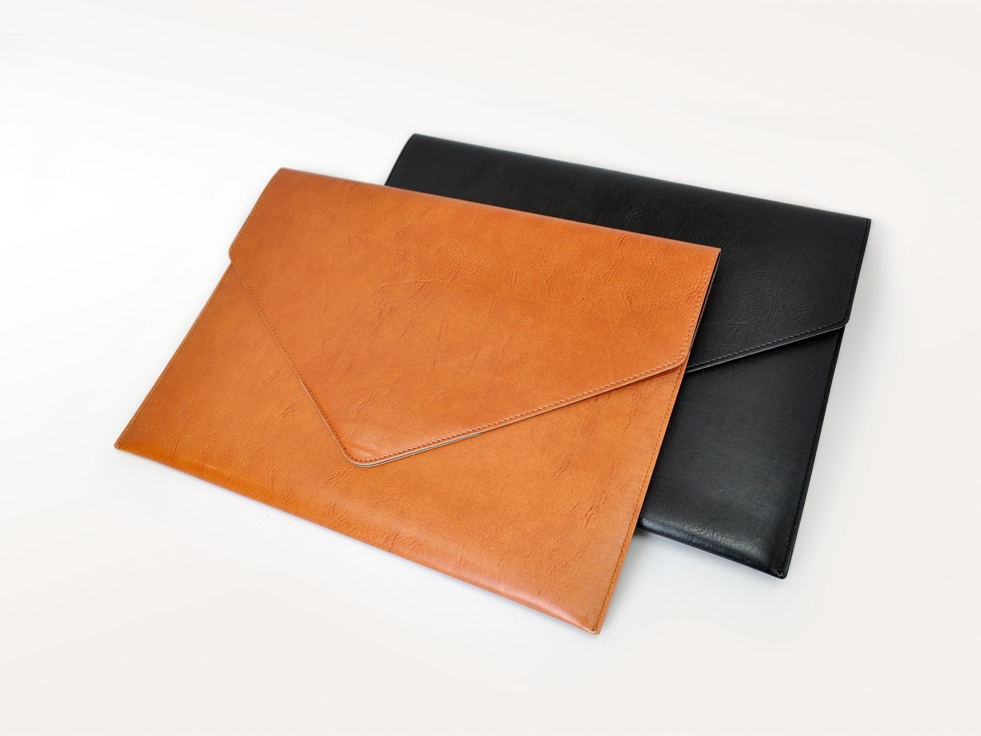 This stylish document folder in black or tan bonded Italian leather is a must have accessory for organized executives. Sleek and modern Italian leather document envelope is handmade from matte bonded leather with a light padded finish. A concealed snap closure keeps the flap closed and allows easy access. The envelope is lined in contrasting leather for a smart finish.