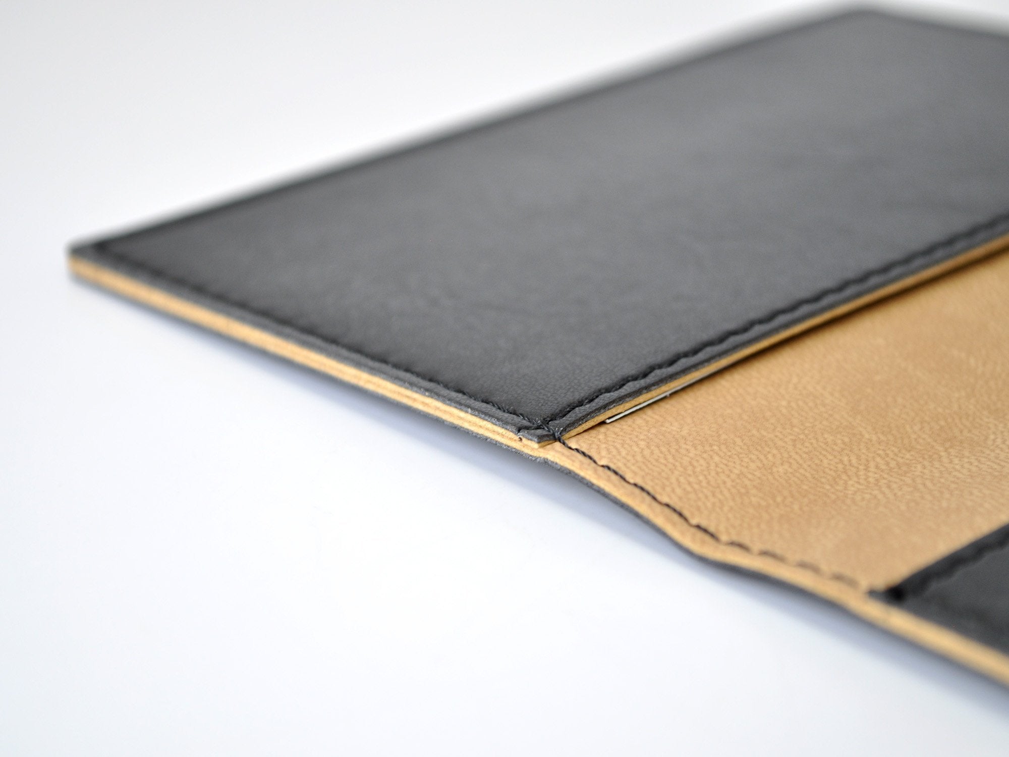 The cover holds a passport, cards, and money or receipts.