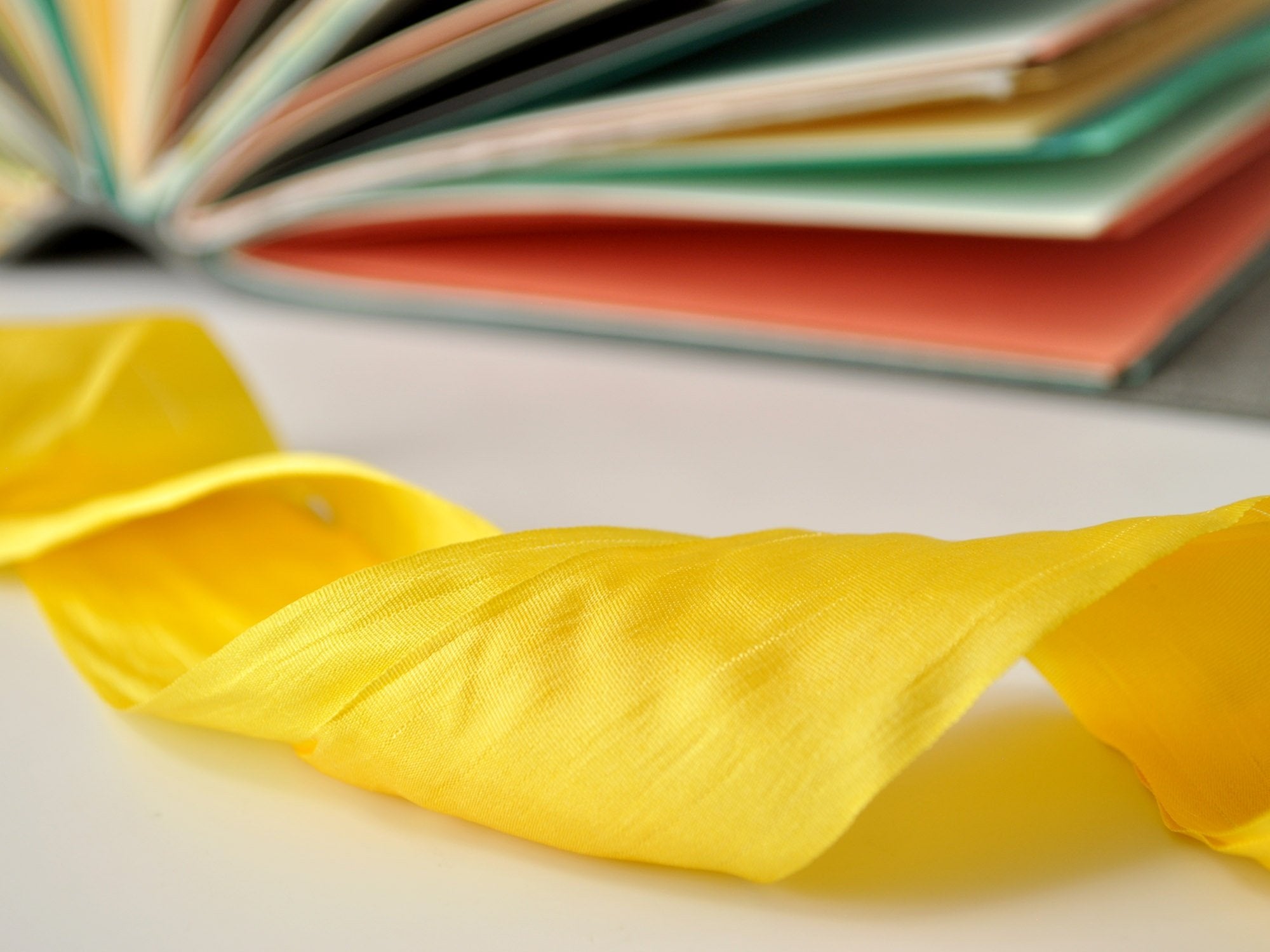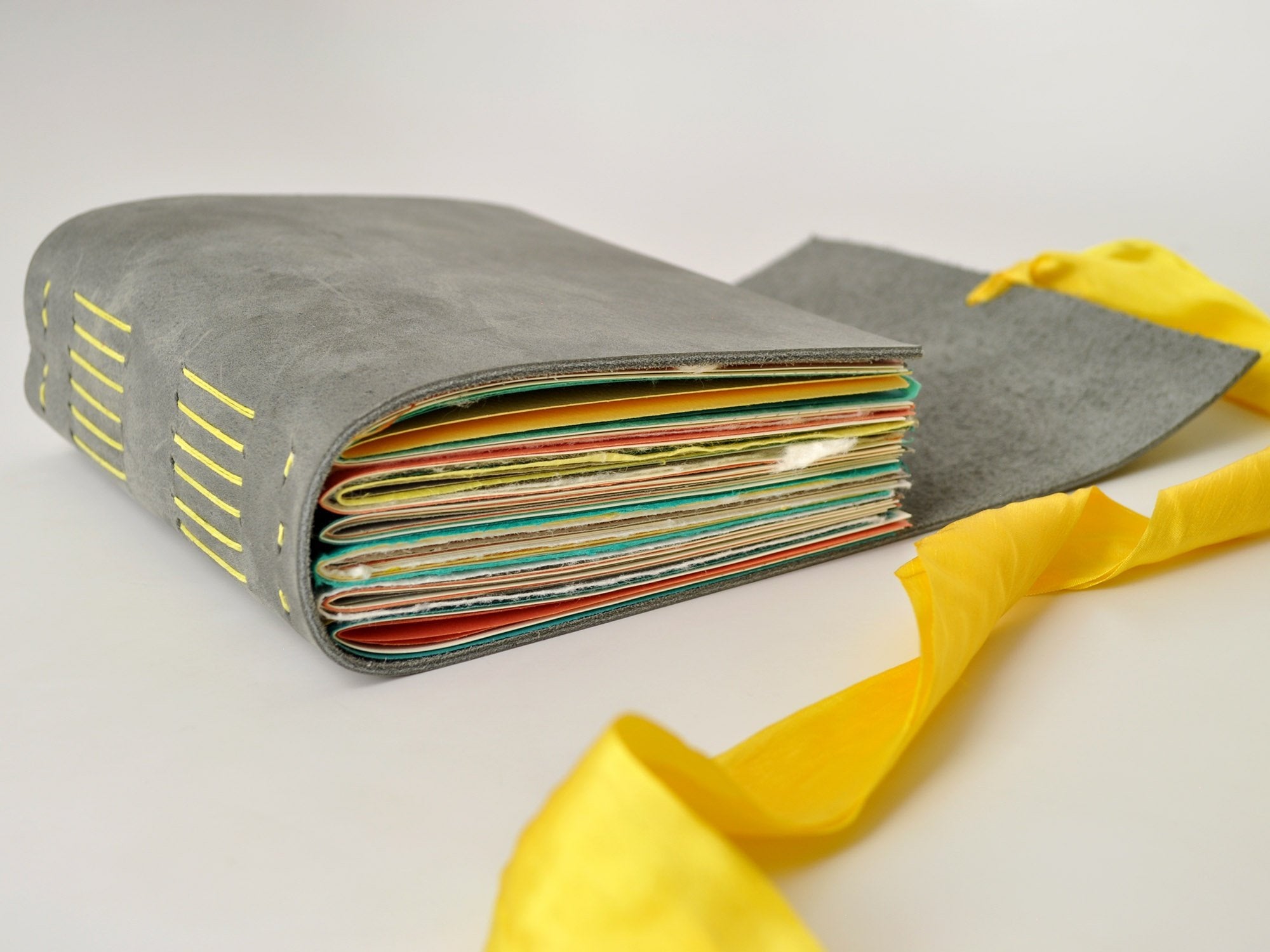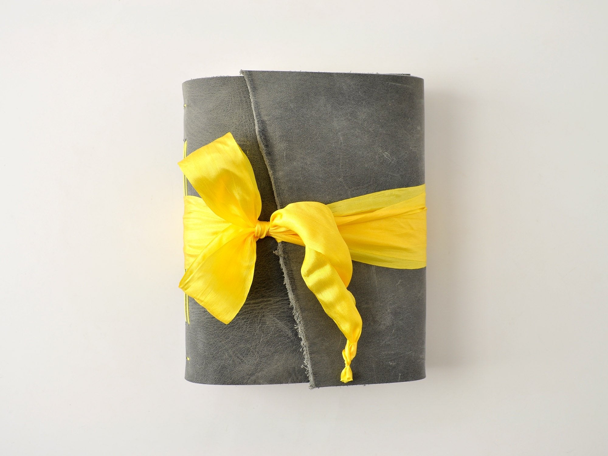 The journal is finished with a flap and yellow silk ribbon that ties around the book block to hold the cover closed when you are not writing.